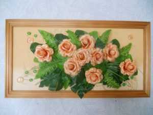 Если материал подвержен разрушению или накоплению пыли, лучше покрыть готовое изделие бесцветным лаком, как фото панно из соленого теста.