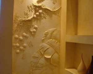 Весьма затратный и трудоемкий процесс. Все выполняется на заранее оштукатуренной поверхности. Делается набросок рисунка, а затем специальная штукатурка наносится с помощью трафарета или самостоятельно корректируется инструментами. Этот вид используется для украшения стен и потолков разнообразными изображениями.