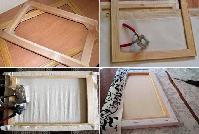 Берут деревянные рейки и формируют из них раму, затем её обтягивают тканью. Для этого выкраивают полотно прямоугольной формы по габаритам рамы, добавляя 2-3 см, чтобы можно было завернуть на изнаночную сторону. После того как ткань натянута, края фиксируют к раме посредством степлера или маленьких гвоздиков.