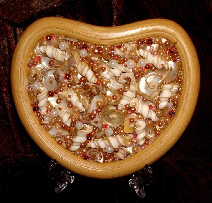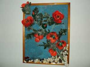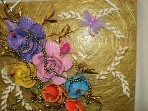 В этом варианте панно все или часть его элементов выполнены из бисера. Для начала делаются сами элементы, а потом уже закрепляются на основу и, по желанию, оформляются в рамку.