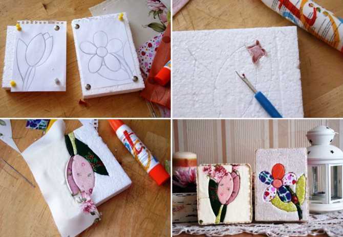 В качестве основы отлично подойдет и пенопласт. На такой заготовке карандашом намечают рисунок или схему, затем подбирают лоскуты ткани разной расцветки и фактуры. По намеченным линиям углубляют края лоскутков в пенопласт с помощью острого инструмента.