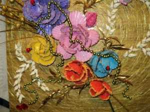 На заднюю стенку картины крепится крючок или пришивается петелька, посредством которых рукотворный шедевр вешается на стену. Поскольку пенопласт очень легкий, его можно приклеить к стене плиточной мастикой.
