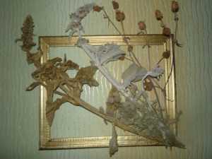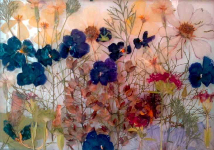 Отлично подходит для детского творчества. Определяемся с сюжетом будущей работы, а затем на твердую основу (картон, ДВП) с помощью клея приклеиваем засушенные цветы и листья (веточки можжевельника, листья деревьев — подойдет любая флора). Отличным дополнением станут зернышки, семечки и веточки.