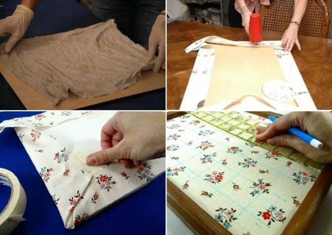 Подготавливается основа из очень плотного картона, ДВП или фанеры. На лицевую часть заготовки натягивают ткань, края которой заворачивают на изнаночную сторону. Чтобы полотно не двигалось, его края фиксируют с помощью клея. Таким способом получают основу, на которую начинают крепить элементы аппликации.