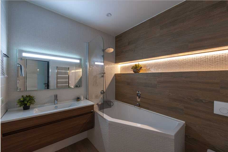 Для любителей расслабляющих ванн, подойдет установка одного или двух приборов с приглушенным рассеянным свечением. С помощью светодиодной подсветки также можно оформить саму купальню по периметру или при недостатке освещения разместить несколько светильников в зоне душа. Лучшим вариантом для зоны влажности станут устройства с возможностью изменения яркости и направления светового потока.