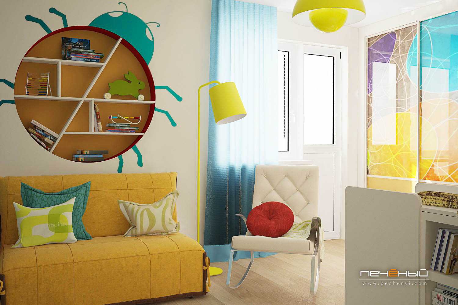 Часто в детской размещают и удобное кресло, в котором мама сможет кормить малыша или читать ему сказки. Полки в стене можно оформить в виде различных зверей — так простой функциональный элемент становится и элементом декора.