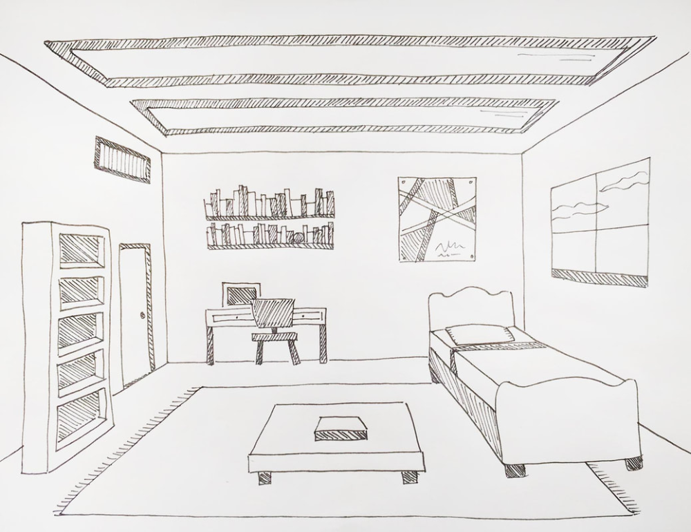 - Этап 3. На данном этапе стираются все линии внутри прямоугольника, кроме линии горизонта. Получается изображение стен комнаты в перспективе. Далее следует нарисовать дополнительные прямоугольники и вертикальные линии, которые служат набросками будущей мебели.