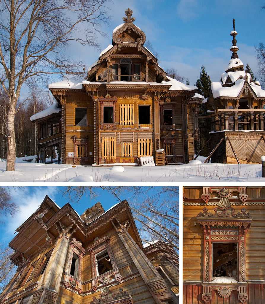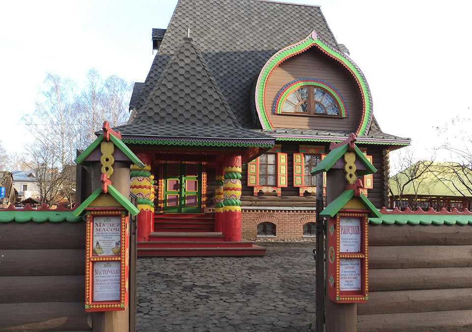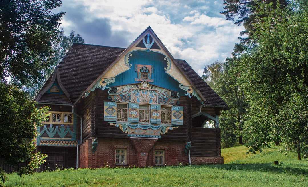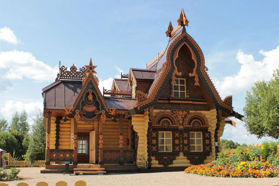 - Наличие элементов, характерных для русского зодчества — узорные резные наличники, ставни, башенки на крыше. Здание может напоминать русский терем, сказочный домик.