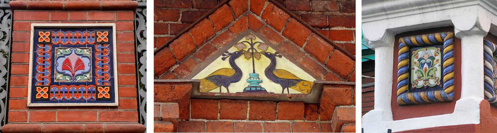 - Над входом и по периметру стен — мозаичные изразцовые пояса, узорчатые фризы и майоликовые панно.