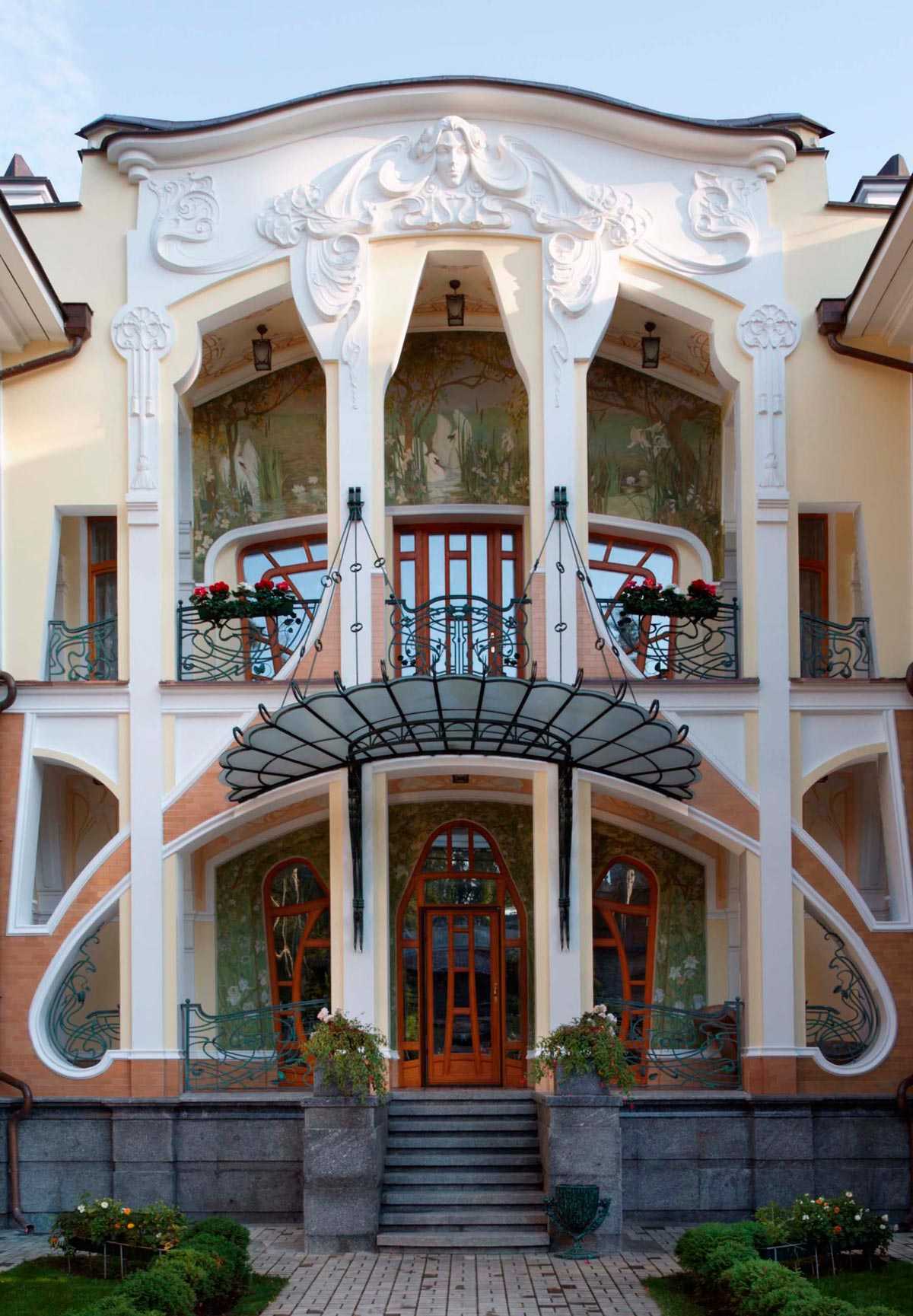 Современная архитектура в стиле модерн. Округлость и тягучесть форм, кованые детали, лепнина, остекление большой площади. В строительстве использованы кирпич, каменные плиты для цоколя, гладкая и фактурная штукатурка. Над дверьми и окнами нетрадиционной формы с деревянными рамами — панно с природным пейзажем. Натуральные, теплые оттенки цветов.