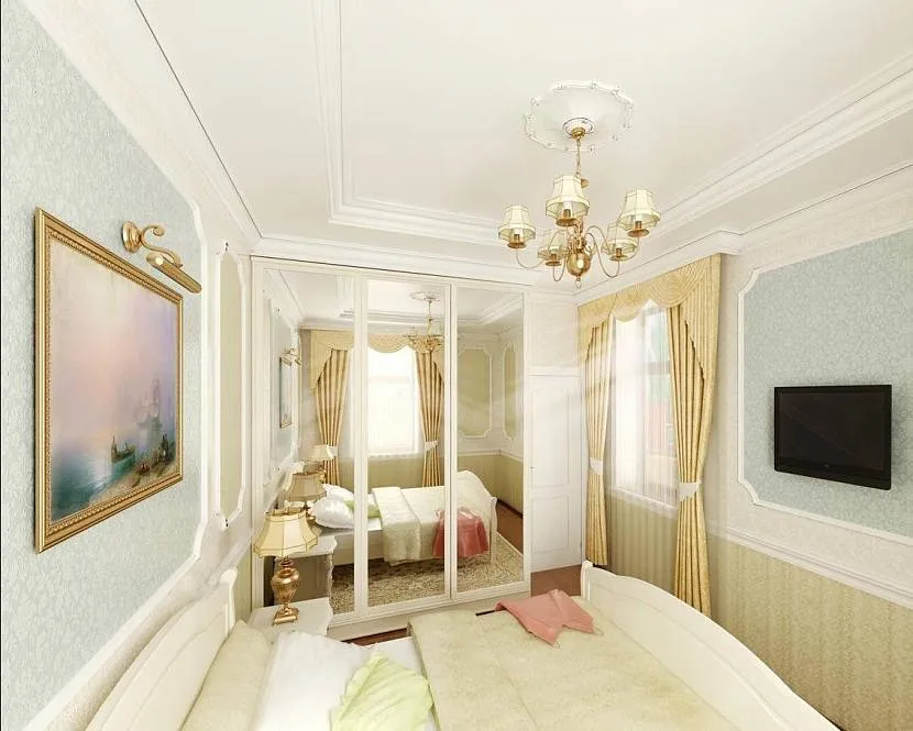 Узкая светлая спальня с кроватью и шкафом-купе с зеркаломИсточник dizajngid.ru