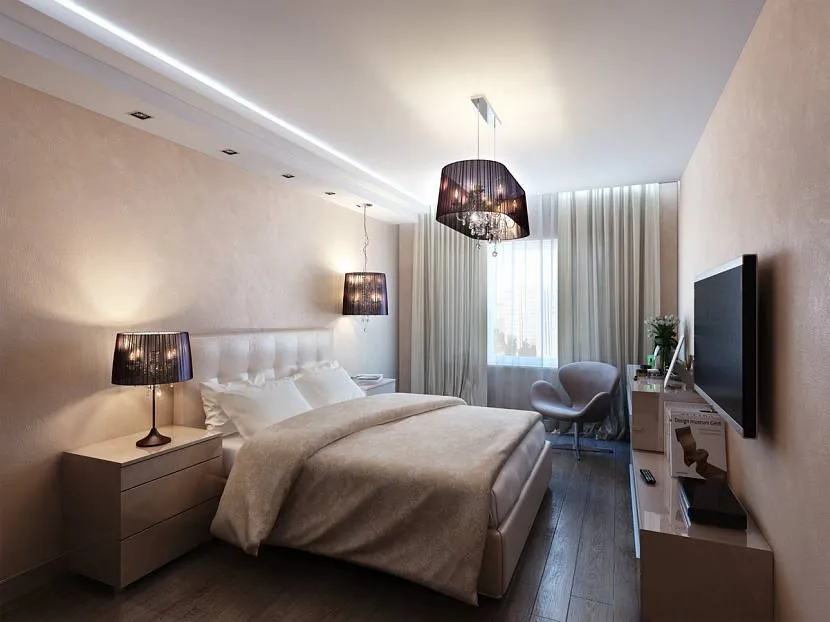 Установка прикроватной тумбочки в узкой спальне создает глубинуИсточник yandex.kz