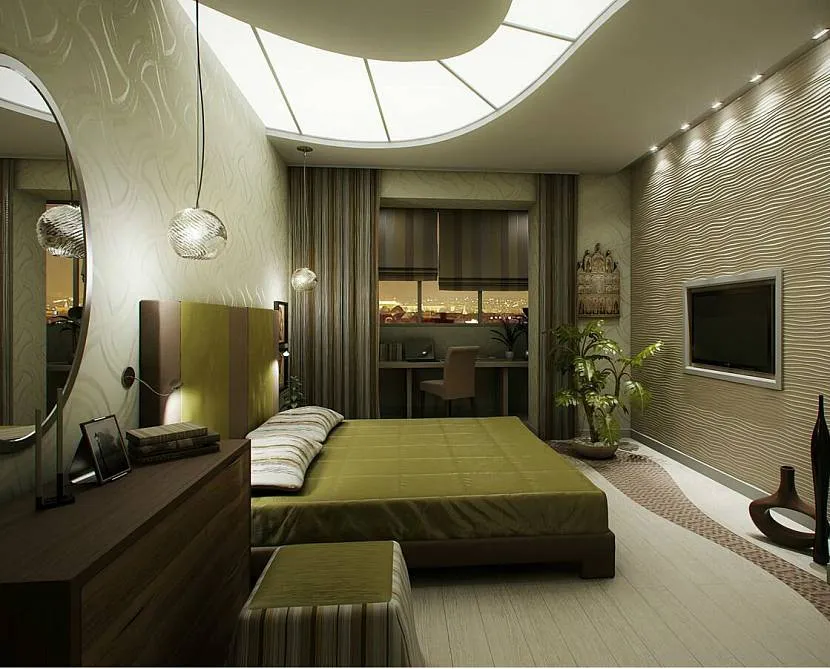 При желании в малогабаритной спальне можно даже скромный рабочий уголок создать. Отделите его от спального места легкой шторой или ширмой. Разместите в этой зоне письменный стол, стул и компактную полочку.