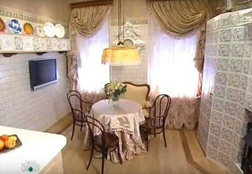 Прежний кухонный гарнитур Немоляевой был выполнен из натурального дерева светлых тонов. Его заменили мебелью с эффектом «состаренности» серого оттенка. Навесные шкафчики светло-серых тонов украсили стеклянными дверцами, установили обеденный стол на гнутых ножках, а спинки стульев декорировали «решётками».