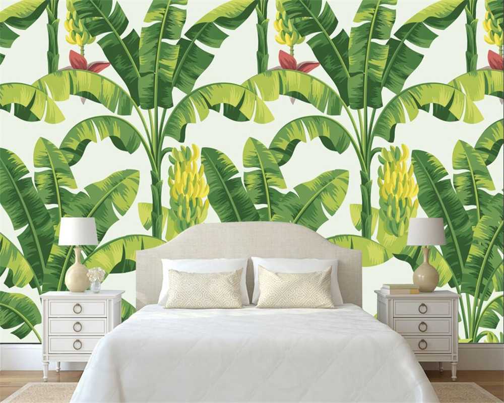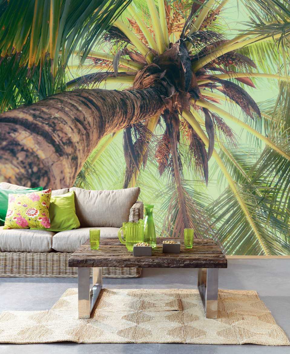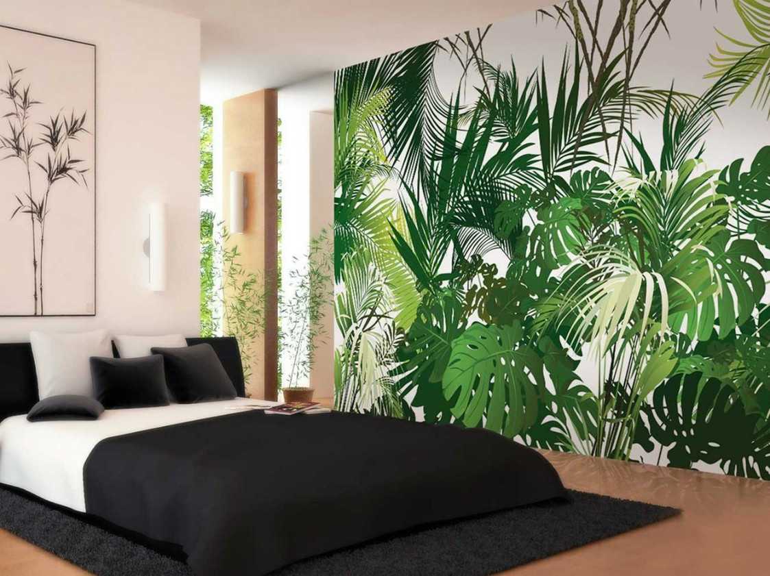 1. Экзотические фотообои. Одним из актуальных методов оформления дизайна в тропическом стиле считается декорирование стен реалистичными обоями. Особенно востребованы крупные тропические растения, пышные пальмы и яркие цветы. Зеленые и желтоватые оттенки насыщают пространство энергией и освежают его. При этом они создают спокойную, умиротворенную атмосферу.