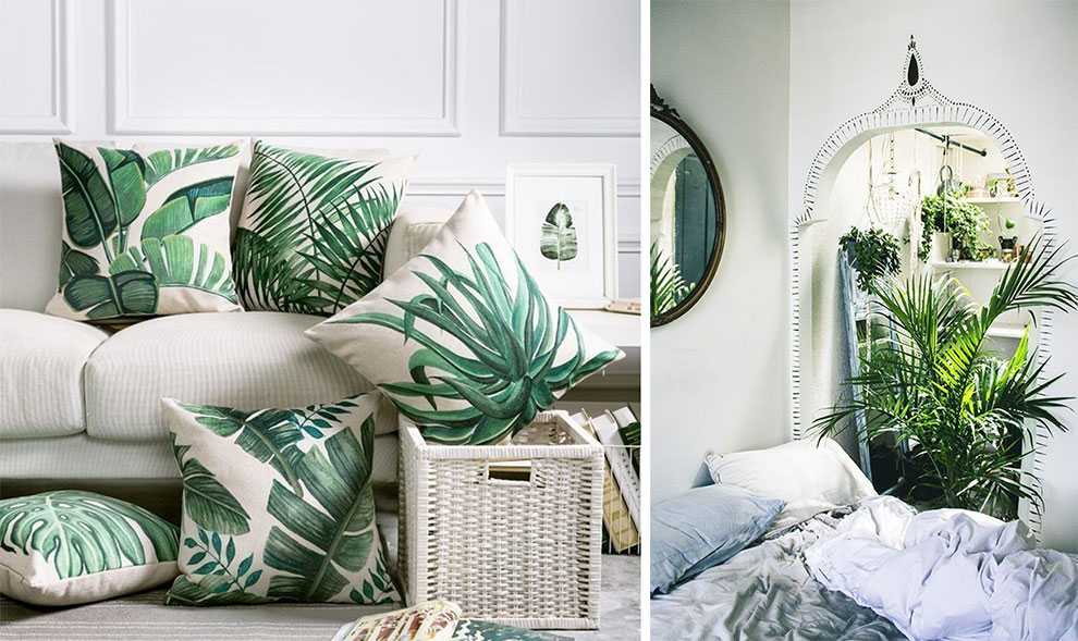 В связке с деревом дизайны листвы будут работать взаимно дополняя друг друга. Дерево хорошо добавиться в интерьер с лиственными принтами, а если дерева много, то яркие лиственные дизайны разбавят пространство, создадут акценты и уравновесят интерьер. На фото-примере собраны варианты балансового сочетания текстур. Подушки с ярко-зеленой листвой удачно гармонируют с плетёными люстрами, дощатой стеной, циновкой, каменной и стеклянными вазами, и завершает картину кожаный диван: