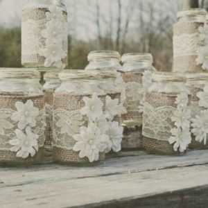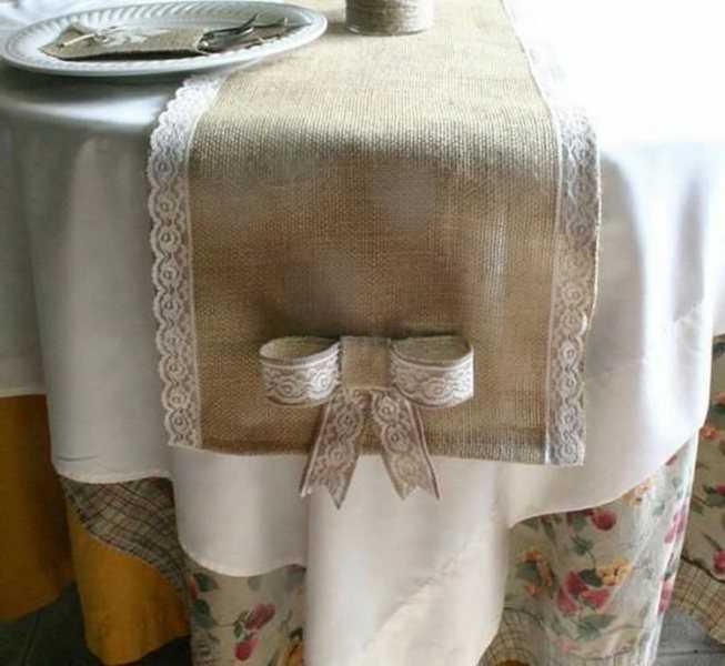 - универсальность. Имея выраженную грубую фактуру, декор из мешковины может сочетаться с другими тканями. Хорошим выбором будет декор мешковиной и кружевом, а также сочетание этого полотна с изящным шелком , материалами в виде дерева, керамических экземпляров, металла, стекла;