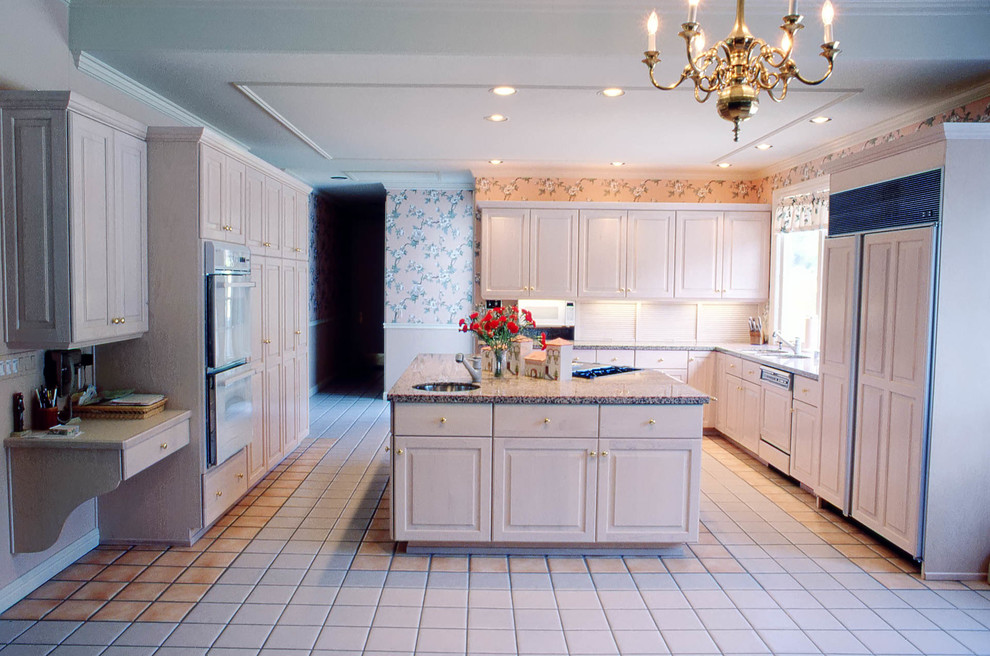 Светлая накладка в интерьере играет своеобразную второстепенную роль. Для разделения комнаты на зоны подбираются белые обои с рисунком. Такой подход будет действовать как отвлекающий маневр. Картины, яркая скатерть, стильные аксессуары помогут оживить кухню, сделать ее жизнерадостной. Обои с рисунком отлично подходят как для обеденной зоны, так и для кухонной части помещения. В качестве орнаментов идеально подходят геометрические узоры, цветы, обои и животные.