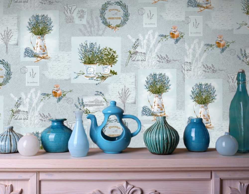 В кухни не обязательно использовать фотообои и постеры с лавандой. Можно обойтись и несколькими деталями, такие аксессуары выгодно дополнят интерьер с лавандовыми обоями.