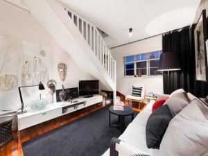 В большой двухуровневой квартире в Лондоне дизайнер тщательно проработал лестничную зону. (смотреть весь проект: Современный пентхаус в мансарде старинного дома – 30 фото). Была спроектирована большая мебельная группа около стены за лестницей. Каждая часть этого большого шкафа выполняет отдельную функцию: под ступеньками – место для отдыха, над ступеньками – открытые полки, закрытые шкафчики и ниши для декоративных статуэток.