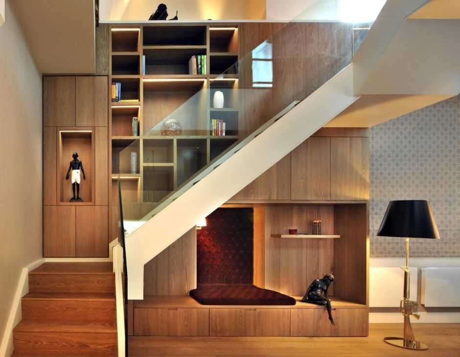 Если вы планируете реализовать эту идею, обязательно обратите внимание на строение самой лестницы: лестницы с подступенками (вертикальными элементами, перекрывающими зазор между двумя соседними ступеньками) лучше подходят именно для организации помещения во внутреннем пространстве лестницы