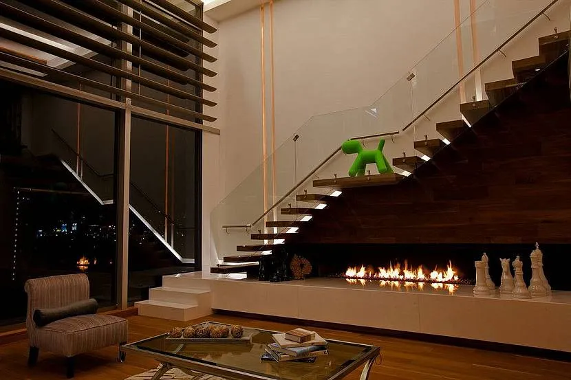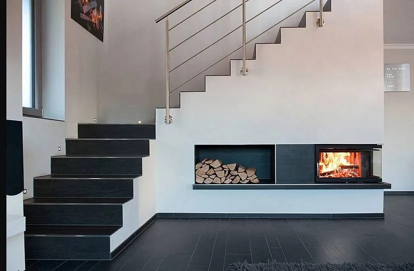 Свободное место под ступеньками в гостиной дизайнеры часто переоборудуют под огнище. Зона превращается в уютный уголок для отдыха. У традиционных дымоходных моделей сложная установка и серьезные требования к безопасности. Вместо дровяных каминов можно использовать электрические и на биотопливе.