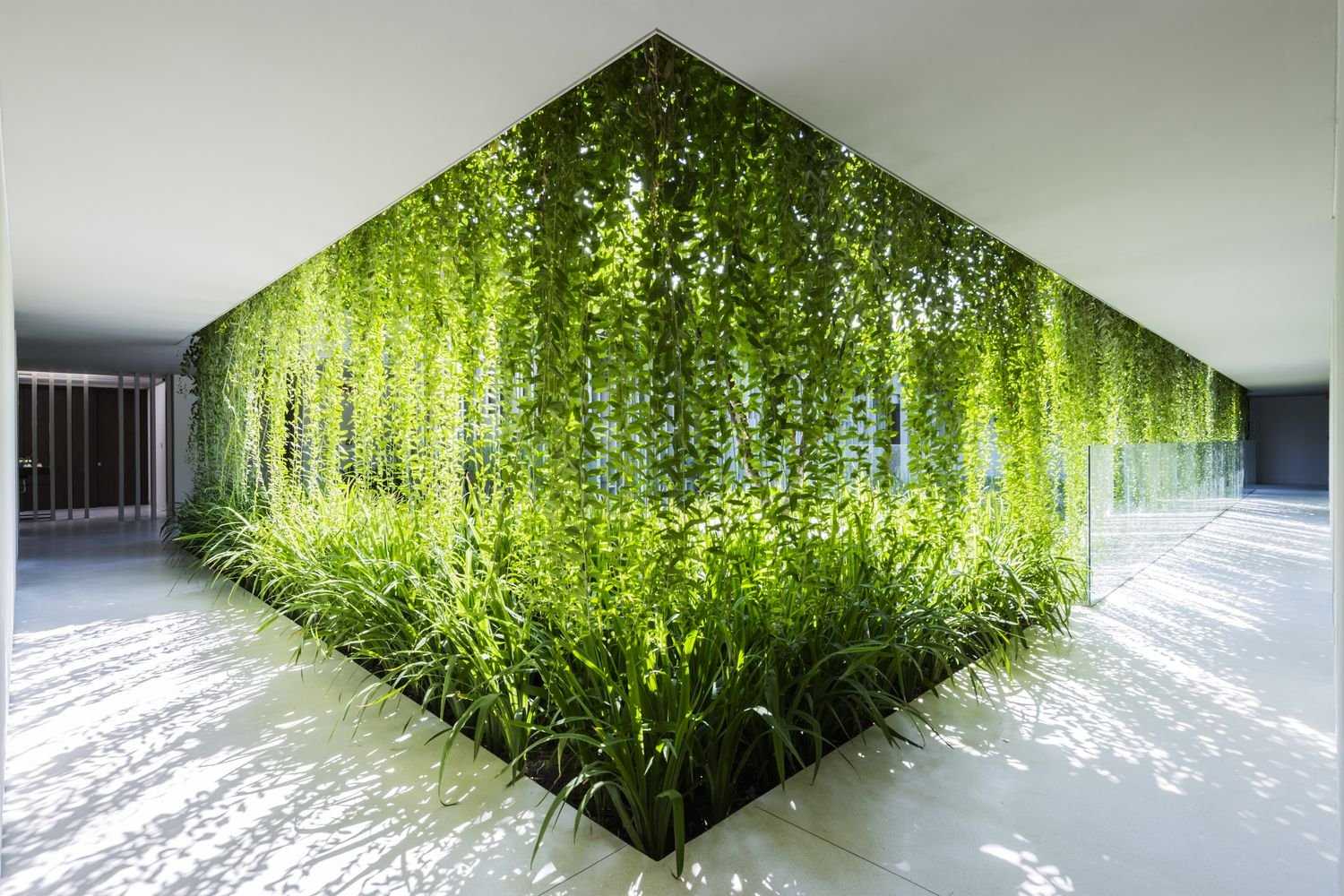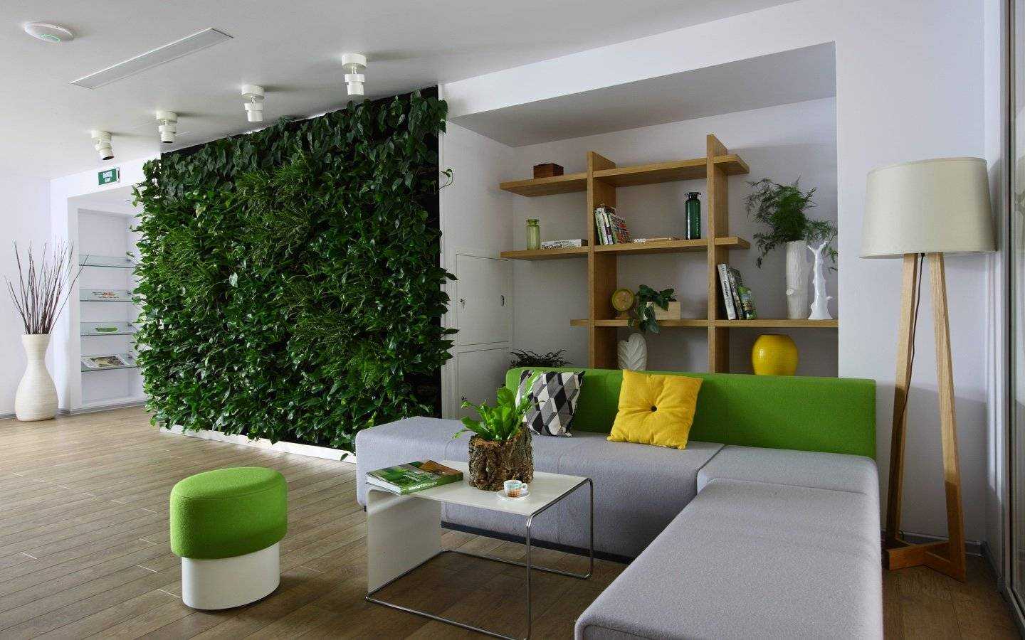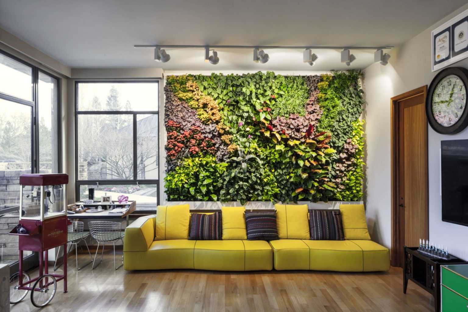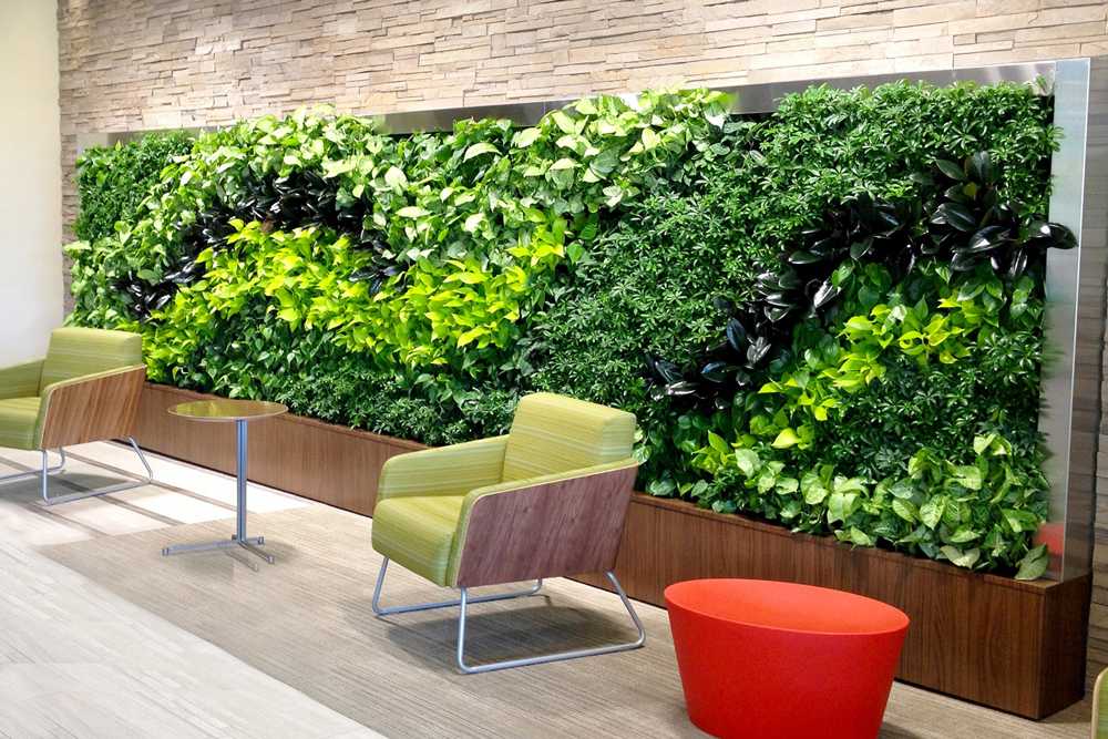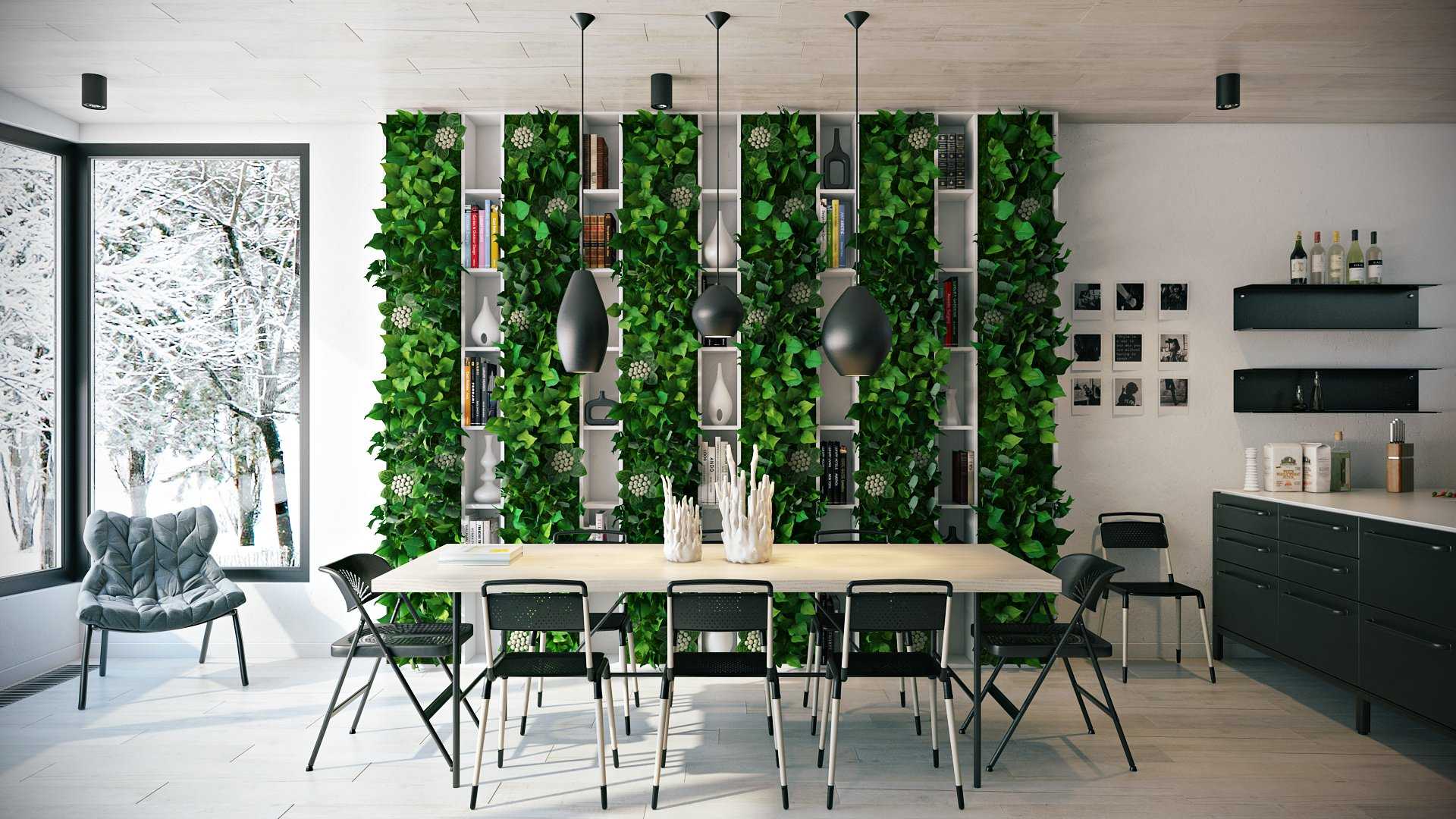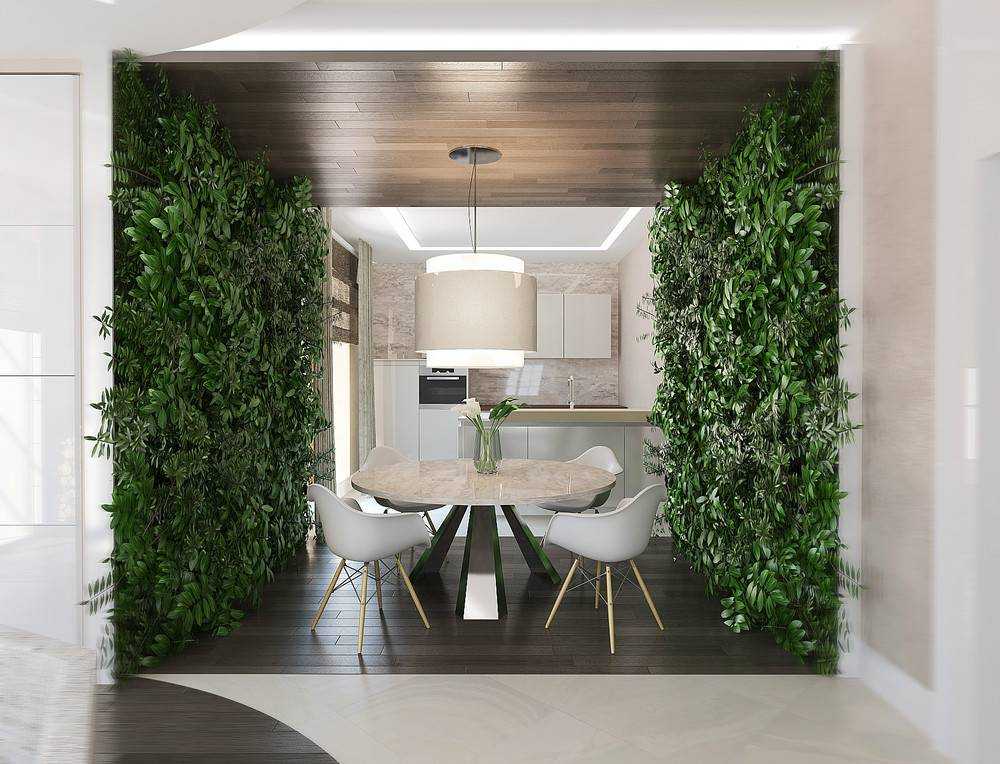 Создание перегородки, заполненной зеленой растительностью — отличный способ разделения пространства на зоны. Перегородка пропускает свет и визуально не уменьшает пространство. Настоящие живые цветы улучшают качество воздуха. Вот подбор разновидностей растительности для разделения пространства: