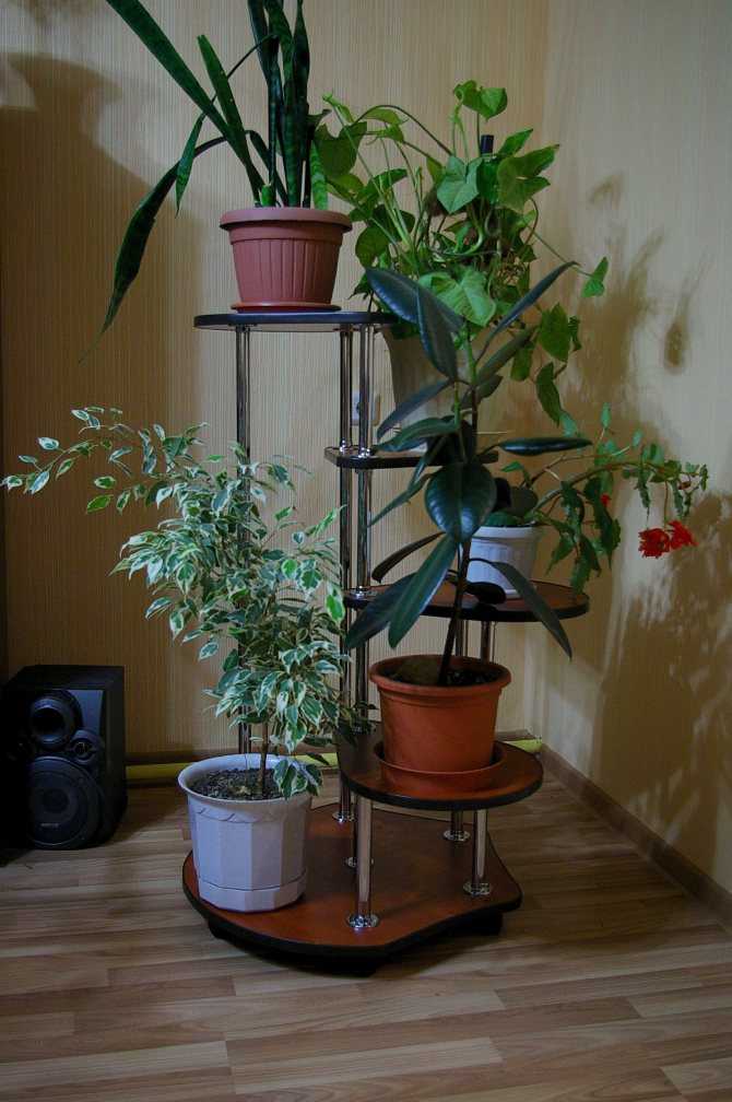 Главное, чтобы цветы не мешали друг другу и не создавали тень. Такая подставка для цветка напольная впишется в углу комнаты либо на балконе. Конструкции бывают спиральными и прямыми. На маленьком пространстве они позволят установить значительное количество горшков.