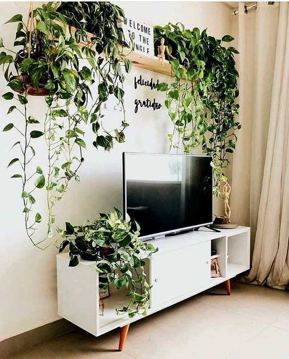 В противоположность предыдущему примеру, в данном случае зелень размещена не под, а над телевизором. Полки могут быть хорошим простым аксессуаром для горшечных растений. В сочетании с висячими вьюнами они выглядят еще красивее. Таким образом вы можете создать красивые панно для своей гостиной и отличное оформление для телевизора.