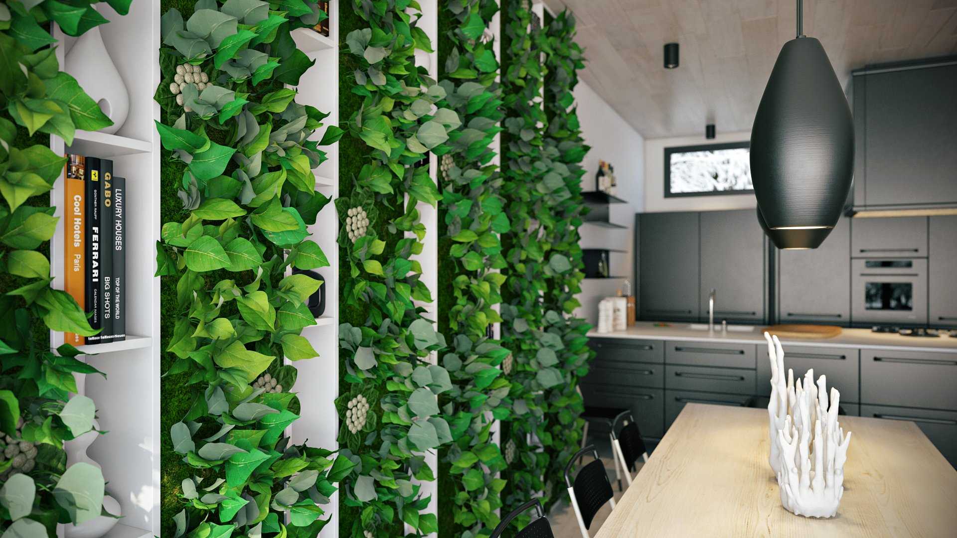 Зелёные растения в чёрной комнате со строгим дизайном