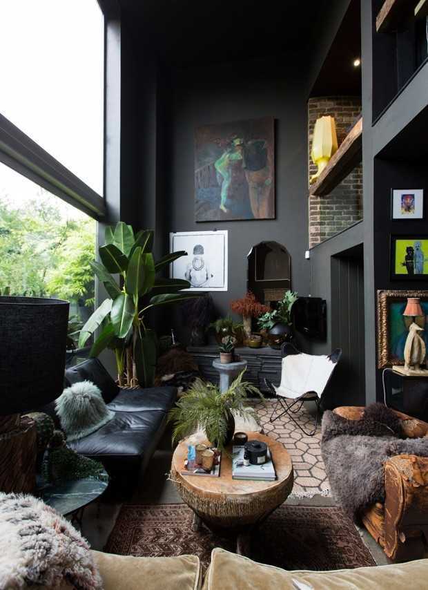 Любая комната, в которой преобладает чёрный цвет или тёмные оттенки, может выглядеть мрачной и безжизненной. В этом случае можно добавить свежести с помощью одного или нескольких ярких представителей живой природы.