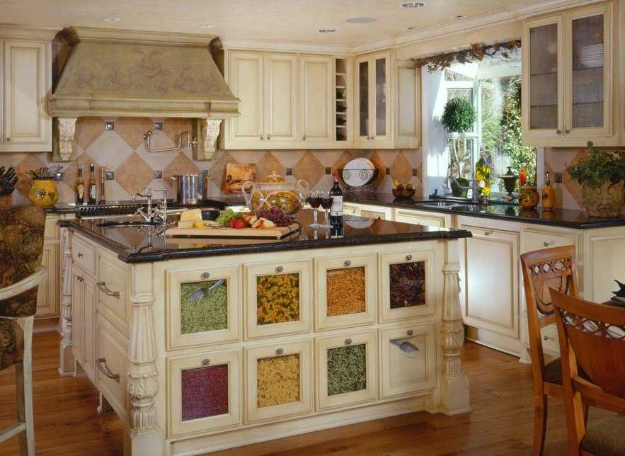 Осень, кстати – лучший повод добавить в интерьер кухни немного деревенского шика. Повесьте занавески из льна, поставьте деревянные полочки и контейнеры для хранения. Получится как на фото:
