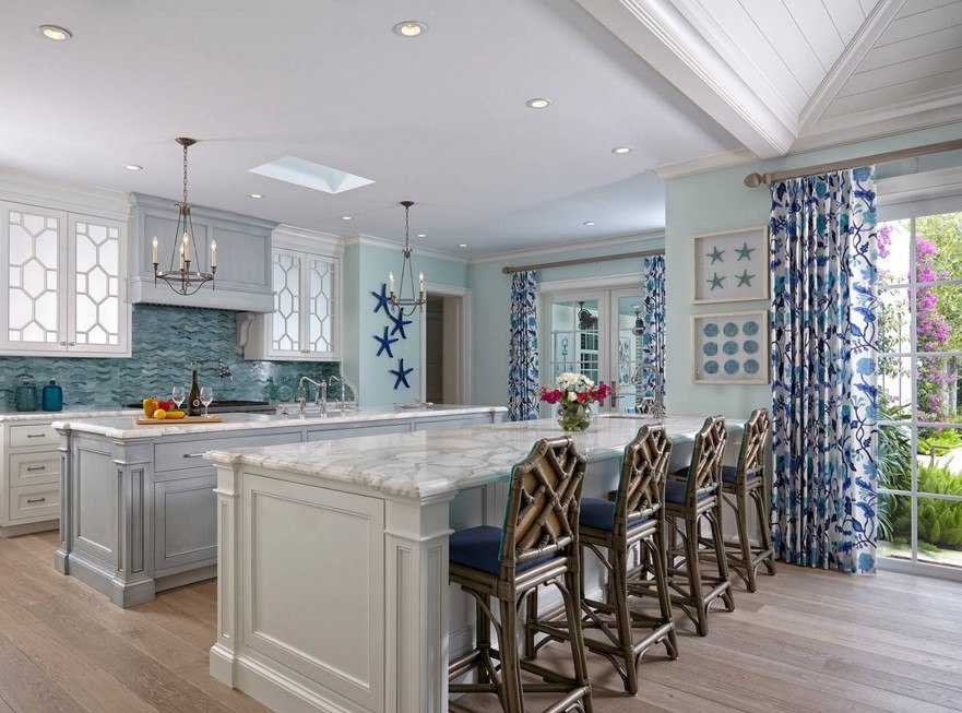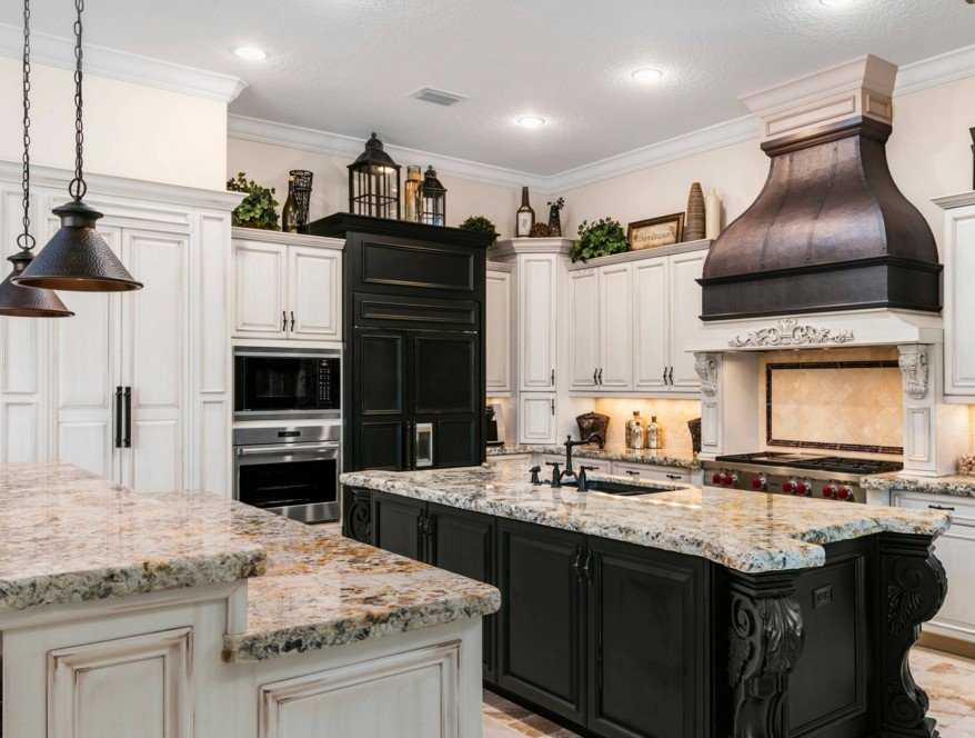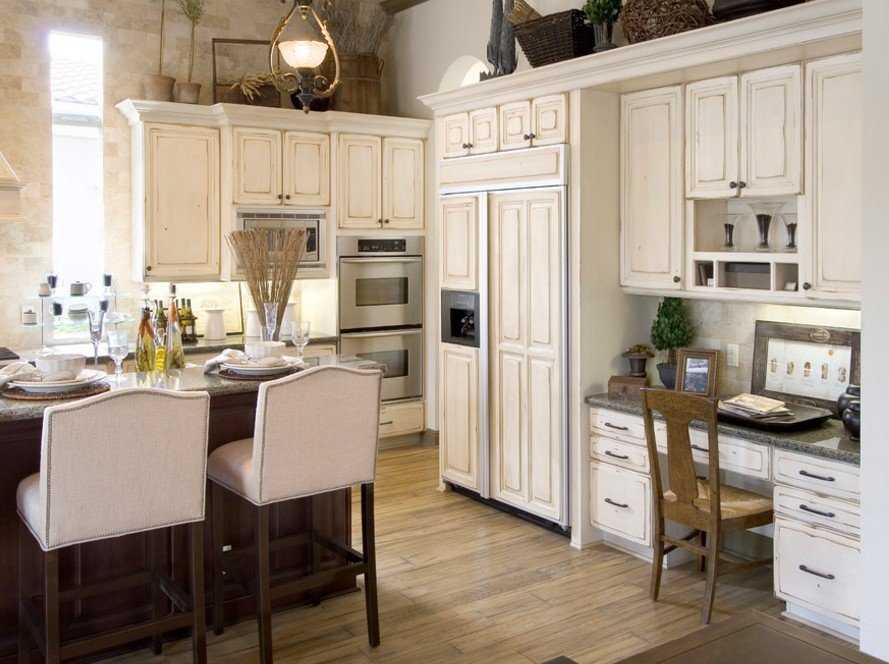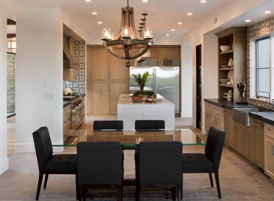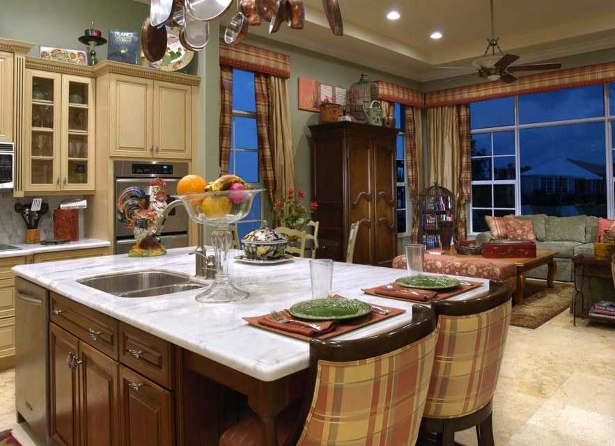 Хорошо смотрятся массивные круглые, овальные или квадратные столы на крупных резных ножках и с таким же резным декором. Их дополняют обеденные стулья, обитые кожей, бархатом или жаккардом. Более современные интерпретации позволяют заменить обеденную зону на высокую и широкую барную стойку, примыкающую к гарнитуру.