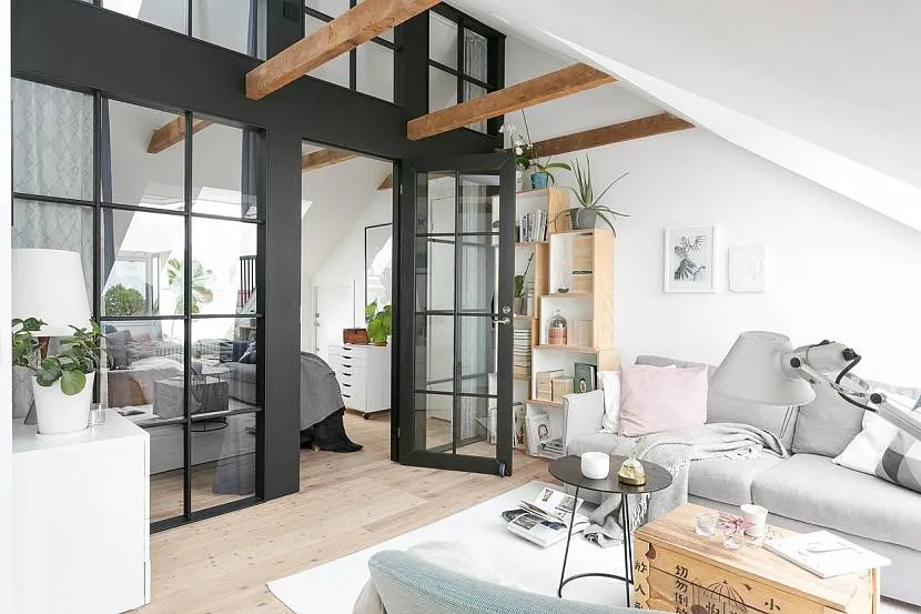 Скандинавский стиль предполагает наличие большого количества естественного света. Потолок и стены в нем обычно белого цвета. Полы изготавливают из светлой древесины. Балки на потолке могут быть естественного светлого оттенка дерева или окрашенные в белый цвет.