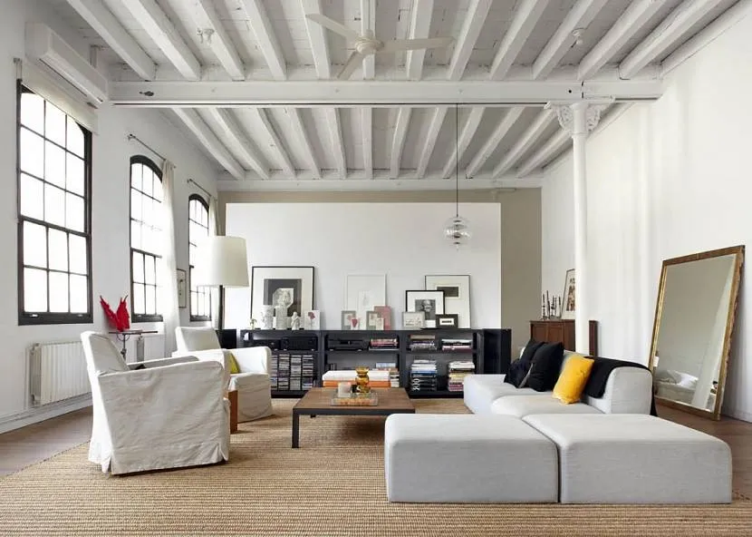 Балки в интерьере, оформленном в стиле лофт, являются обязательным атрибутом. Они могут быть деревянными или металлическими. Для деревянных разновидностей приветствуется грубоватый «необработанный» внешний вид. Металлические балки окрашивают в темный серый или черный цвет. Желательно, чтобы на их поверхности явно угадывались сварные швы, болты, заклепки. Если изначально плиты перекрытия уложены на бетонные потолочные балки, то их оставляют открытыми в естественном виде без наружной отделки.