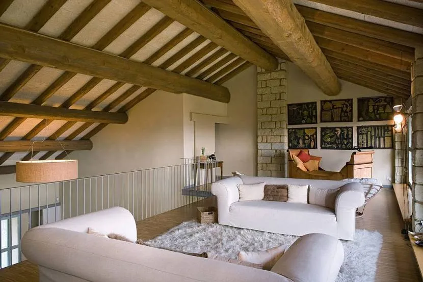 Потолочные балки встречаются не только в традиционных деревенских интерьерах типа Прованс, рустик или кантри. Современные «холодные» интерьеры становятся более теплыми и уютными с деревянными балками на потолке. Особенно эффектно они смотрятся в тандеме с бетонными стенами и кирпичной кладкой.