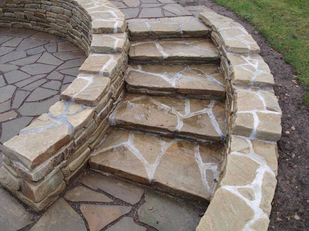 Ступени лестниц выкладываются плитками или изготовленными по шаблону цельными плитами. Подступенки в целях экономии облицовывают мягким камнем (например, песчаником), его поры заполняют шпатлевкой, так за ним проще ухаживать.