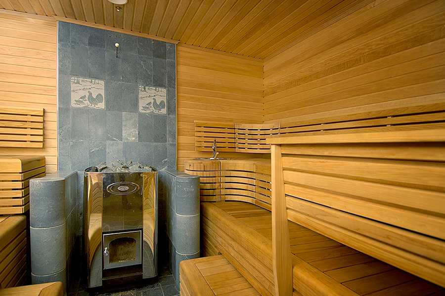 Помимо того, породы, нагреваясь, выделяют полезные вещества, благотворно воздействующие на человеческий организм. А еще дуб, осина, сосна демонстрируют колдовскую красоту. Облицовочный материал, изготовленный из этих пород, безупречно смотрится и на потолке, и на полу, и на стенах. Кроме древесины, прекрасна отделка комнаты отдыха и тамбура, выполненная из следующего сырья: