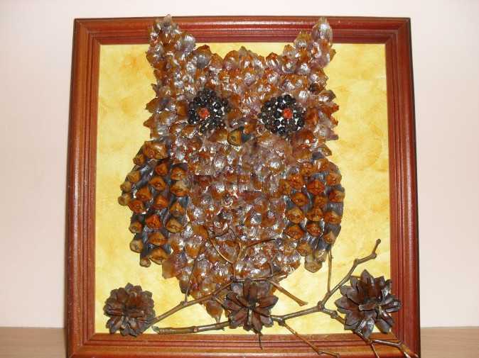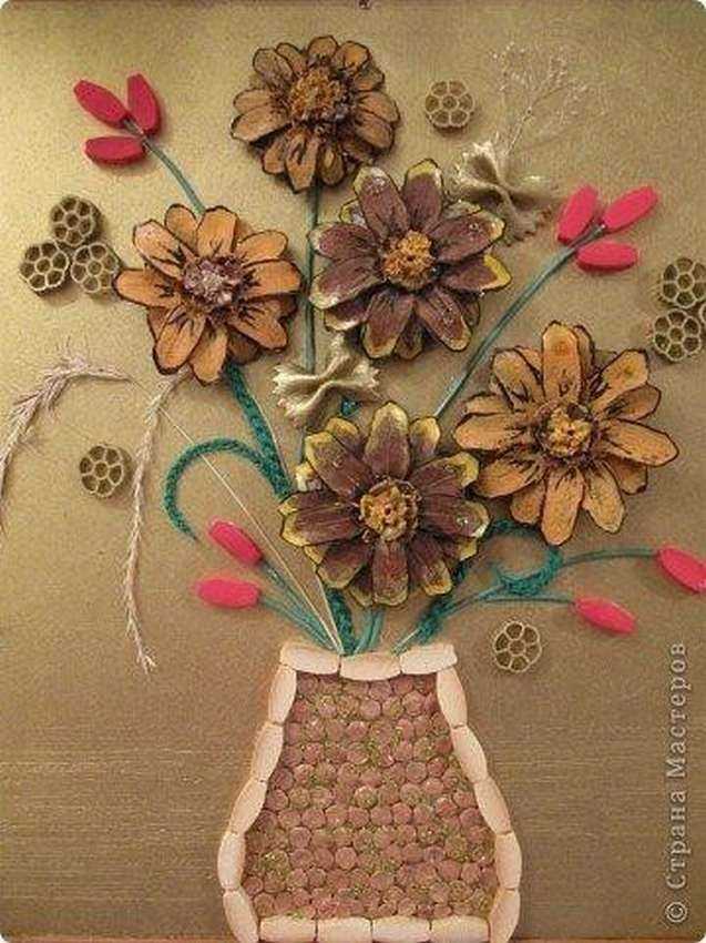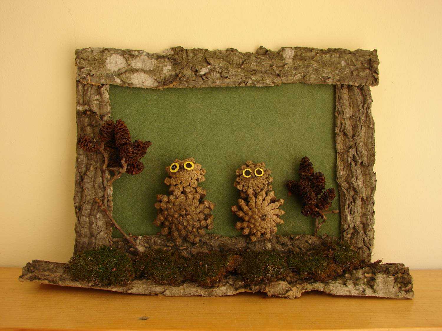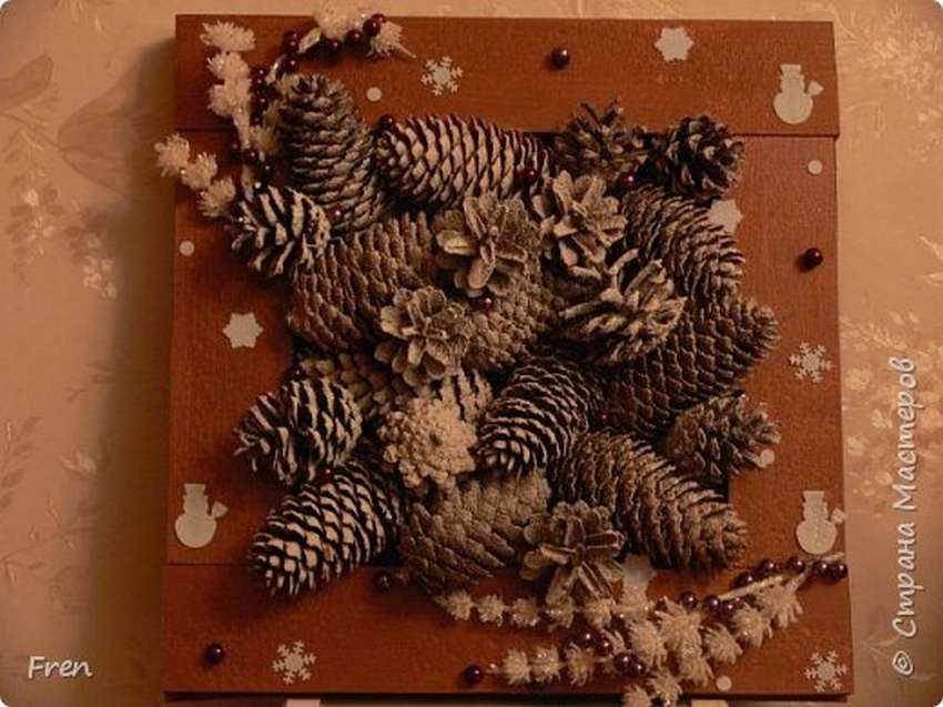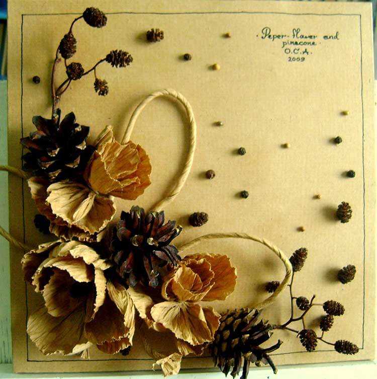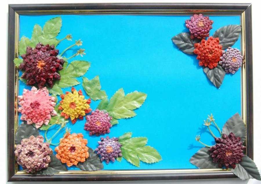 Это очень простая поделка картина из шишек могут сделать дети младшего возраста. По сути, обычная аппликация , необходимо просто приклеить заранее сделанные из шишек и других природных материалов цветы к любой поверхности, которую потом можно располагать вертикально. Прекрасная идея – сделать картину из шишек своими руками для праздничного декора или оригинального красивого подарка.