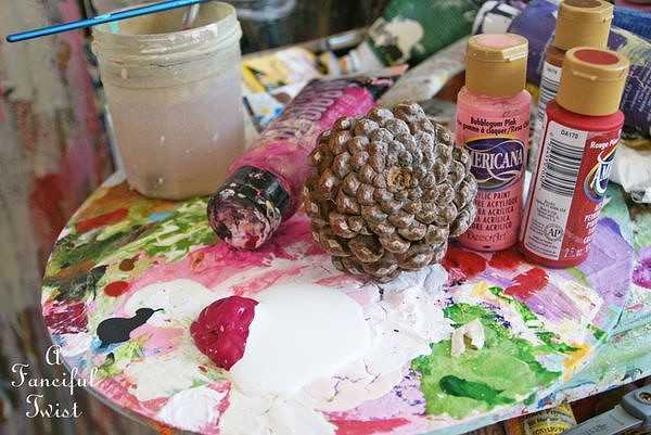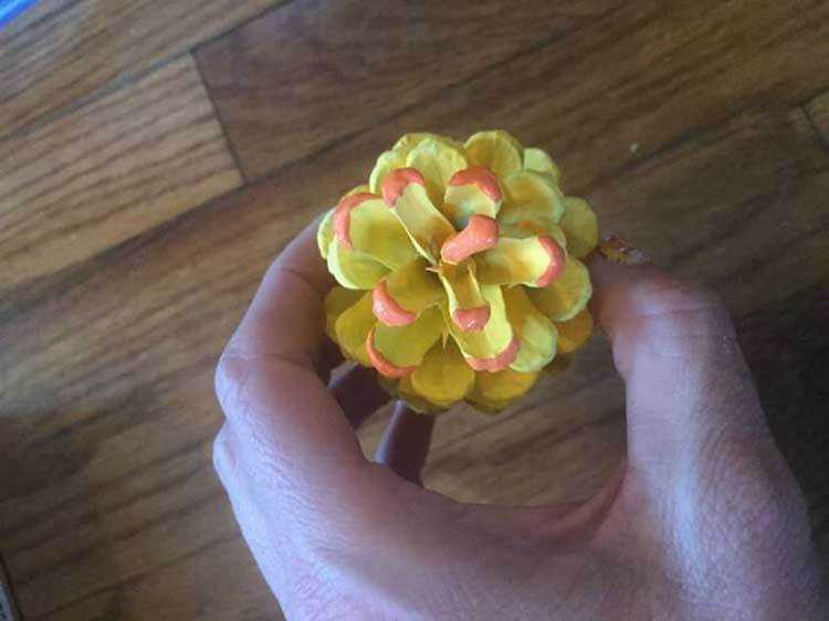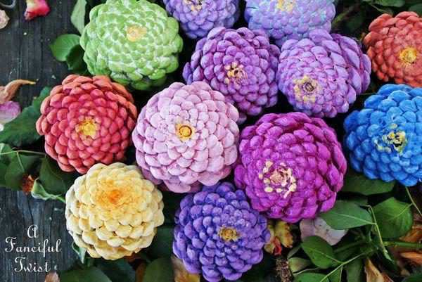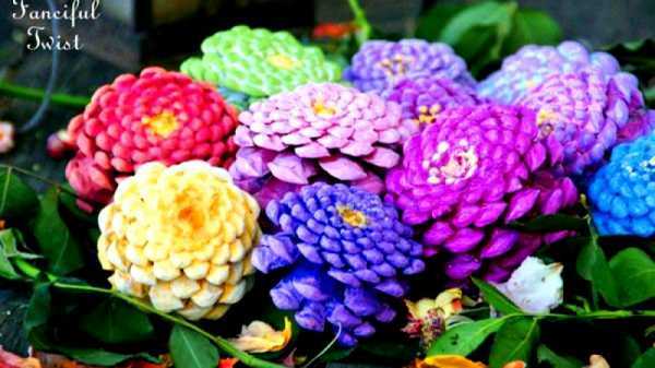 Нам и делать-то ничего особо не придется — лишь раскрасить шишку яркими акриловыми красками, да обрезать лишнее, формируя цветок!