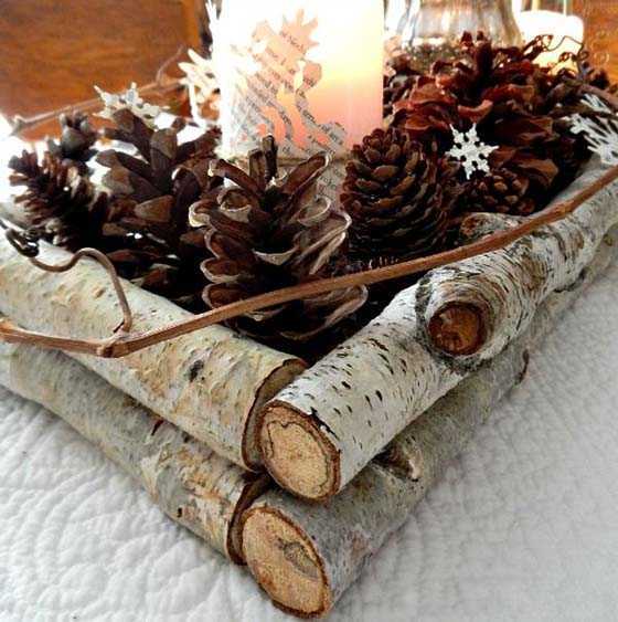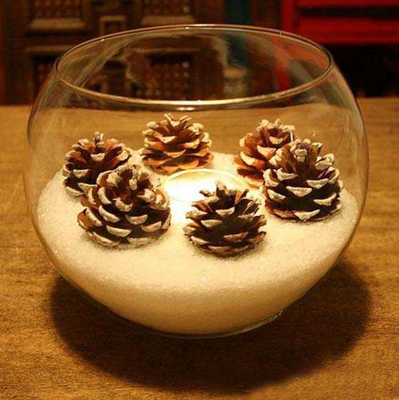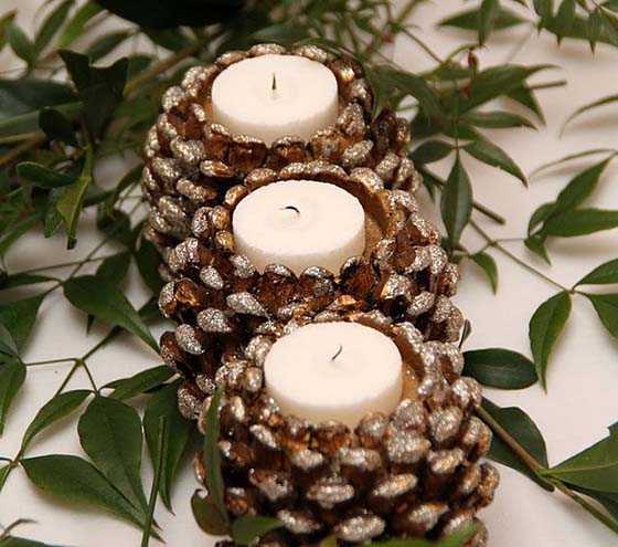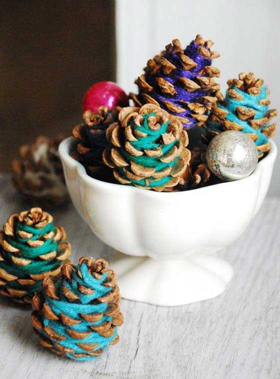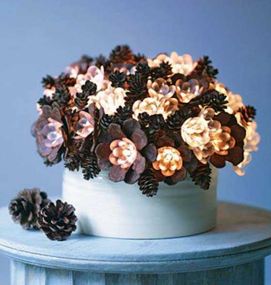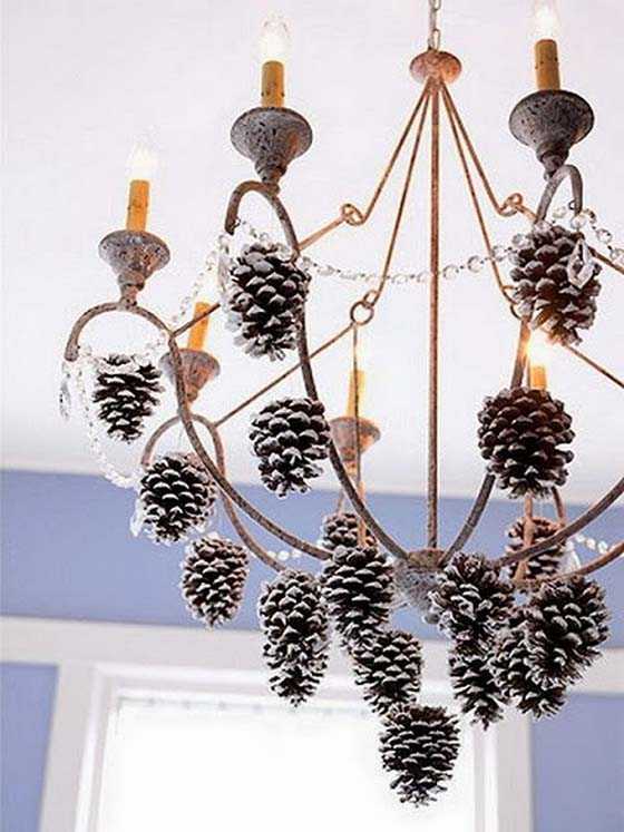 Чтобы новогодний декор из шишек был еще более ярким и торжественным– украсьте его светодиодными лентами / гирляндами, веточками, ягодами, бантами, бусами.
