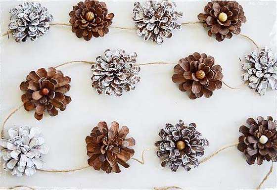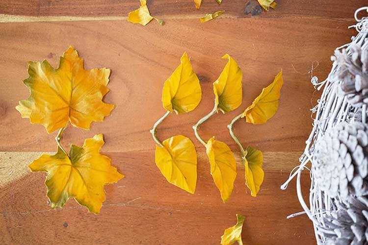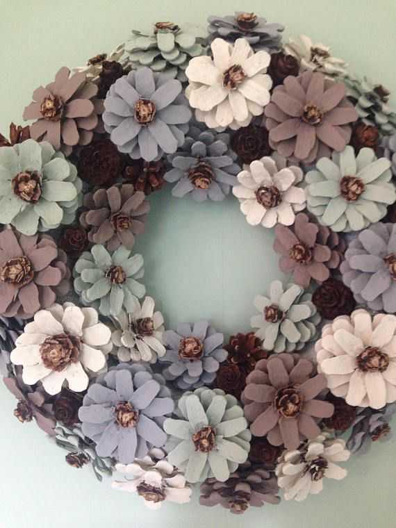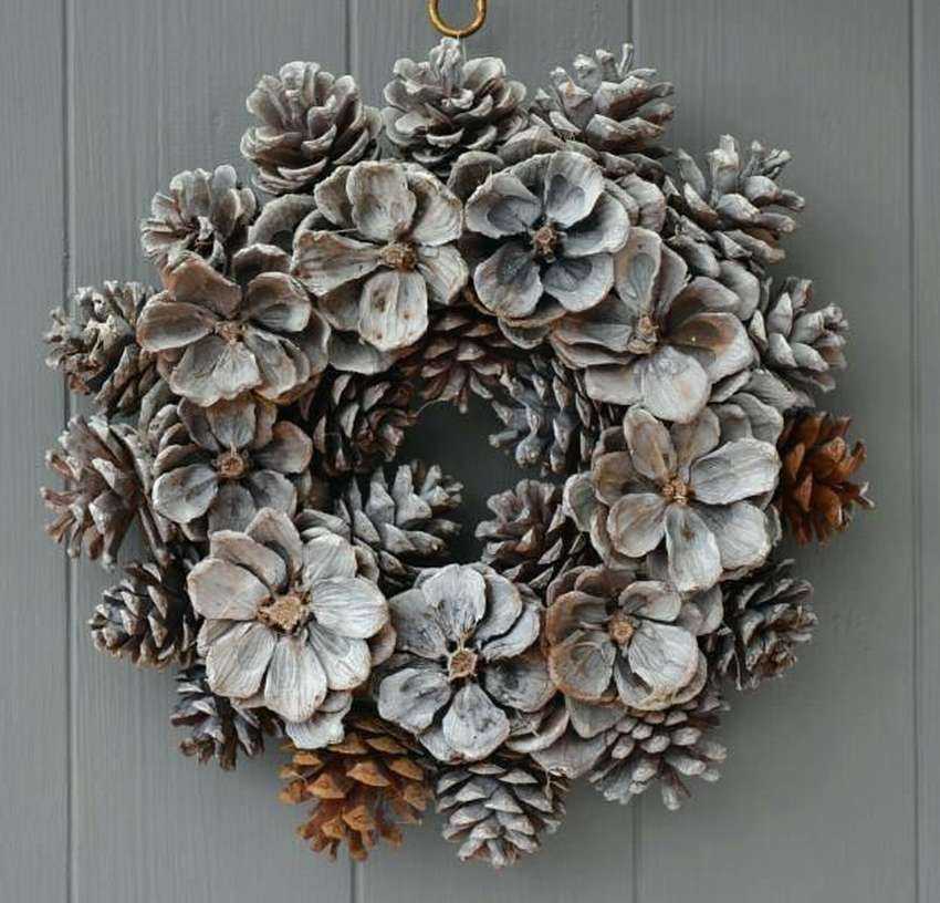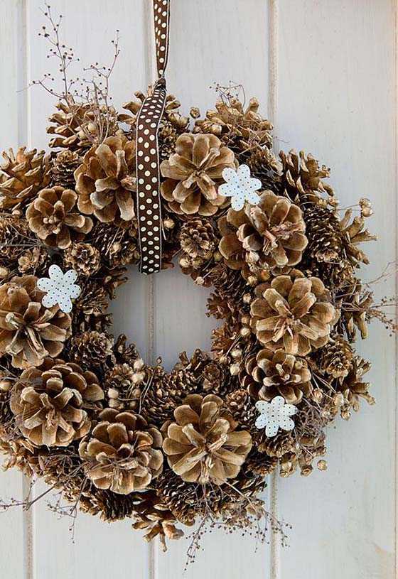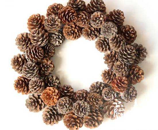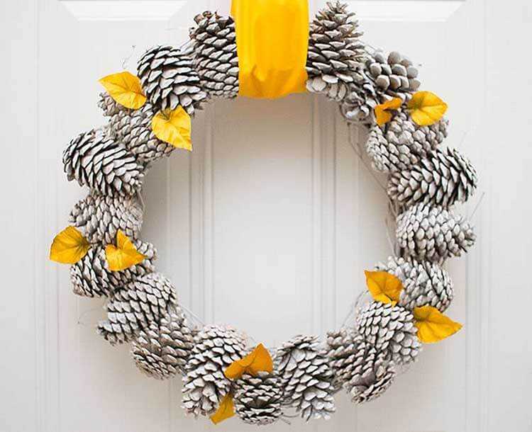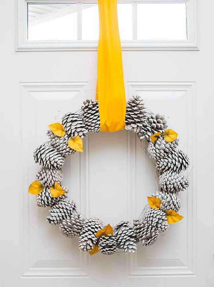 Можно сделать более строгий венок из сосновых шишек. Для этого вам потребуется покрасить шишки в белый цвет и разбавить их желтыми листиками.