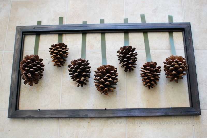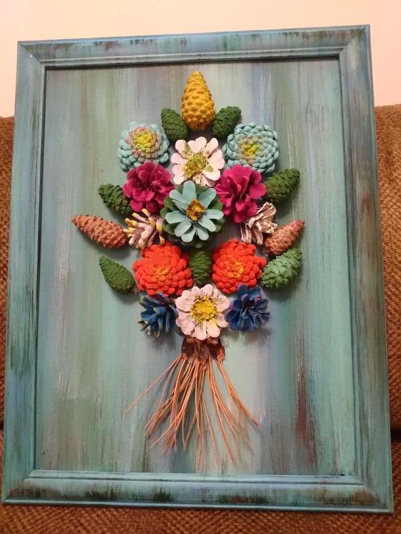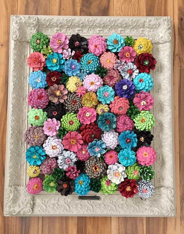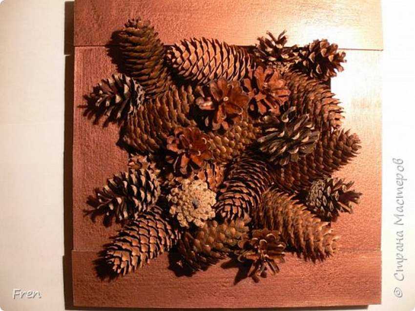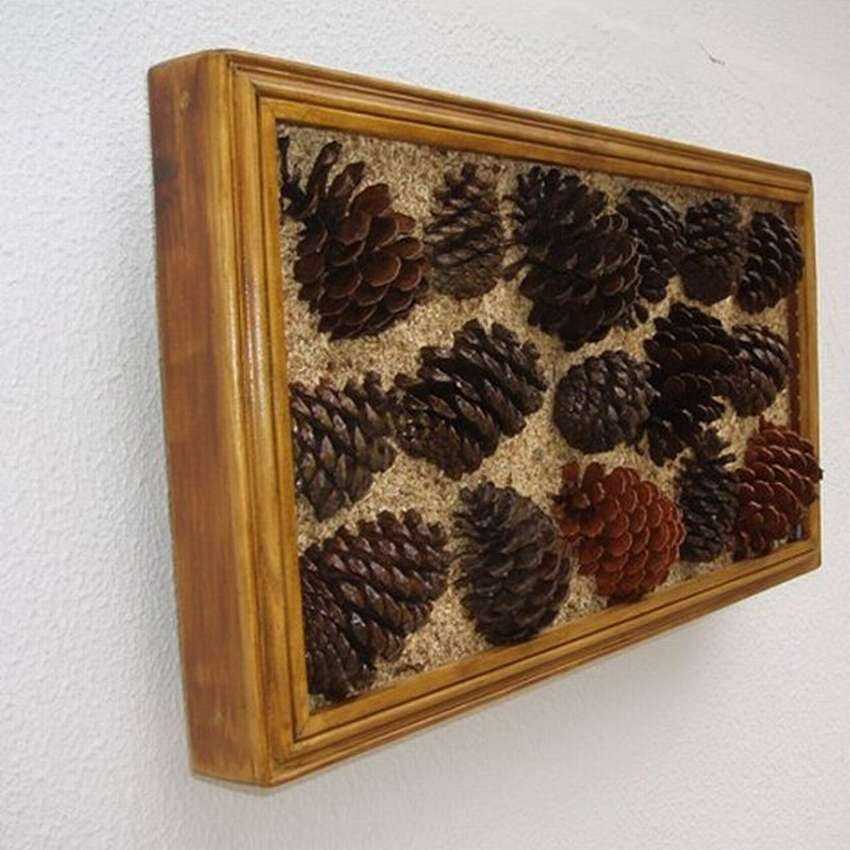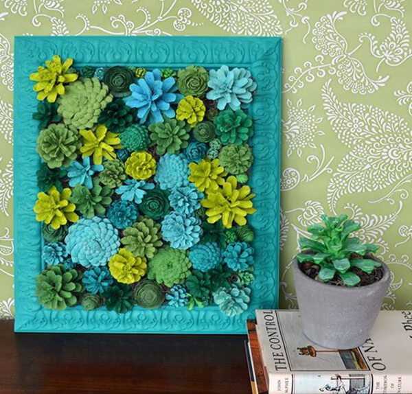 Здесь показано, как сделать панно из шишек в виде цветов в красивой рамке. Цветы по своей структуре итак напоминают шишки, а если их еще раскрасить соответствующим образом, то сходство поразительное. Подготовленные и покрашенные сосновые шишки можно использовать по-разному. Один из вариантов – превратить в вертикальный сад. Кроме шишек, понадобится рамка . Также приготовьте горячий клей, зелёную краску различных оттенков, ножовку для обрезания шишек. Дальше, пожалуй, все понятно, просто посмотрите пошаговые фото . Наклеивайте шишки, как вам нравится, пусть они немного выступают за раму. Между шишками можно добавить немного сухого мха .