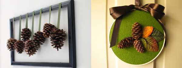 Такие украшения из шишек широко применяют при оформлении помещений к Новому году по всему миру. Их вешают внутри помещения (над камином, окном, диваном) и снаружи на входной двери.