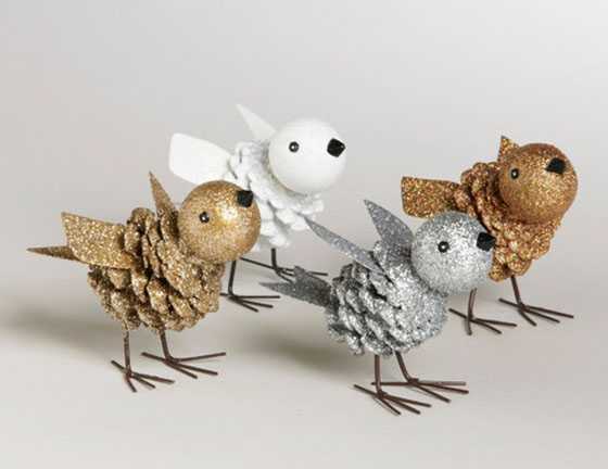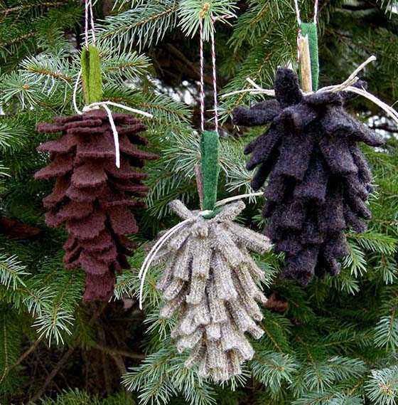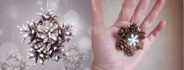 При необходимости к этим новогодним поделкам можно смастерить ручки также из шишек или других материалов: лозы, искусственного ротанга, веточек.