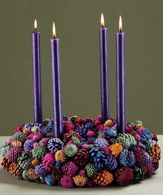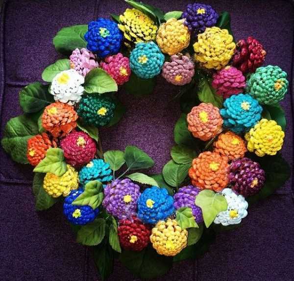 В первую очередь необходимо покрасить шишки. Вы можете выбрать краску любых цветов. Здесь ваша фантазия может гулять, как угодно. Выберите цветовую гамму, которая подойдет к интерьеру вашего дома. Но вначале необходимо покрасить шишки белой краской, чтобы разноцветная краска легла красивее и ярче.