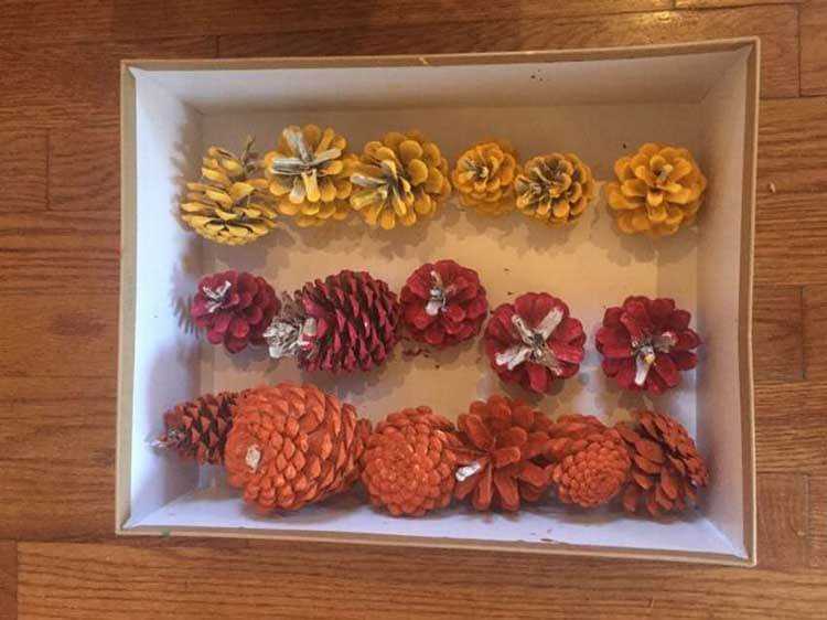 Собрав необходимые материалы, их необходимо подготовить к работе. Шишки и будущие цветочные лепестки, веточки покрасьте в нужные цвета.