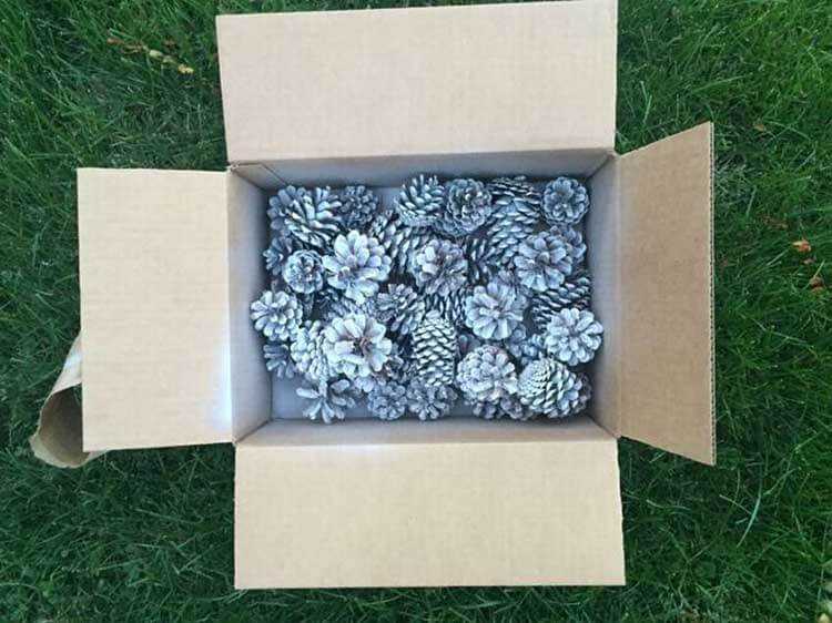 Выложите шишки в коробку и покрасьте с помощью аэрозольной краски белого цвета.