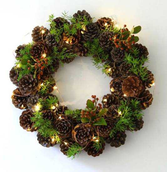 Совет: при фиксировании шишек, направляйте их конусами в разные стороны. Так новогодний венок из шишек будет более естественным и объемным.