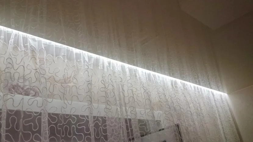 К подготовленной поверхности крепится специальный карниз, на котором будут удерживаться шторы. Особым образом крепится светодиодная лента, создающая эффект парящих гардин.